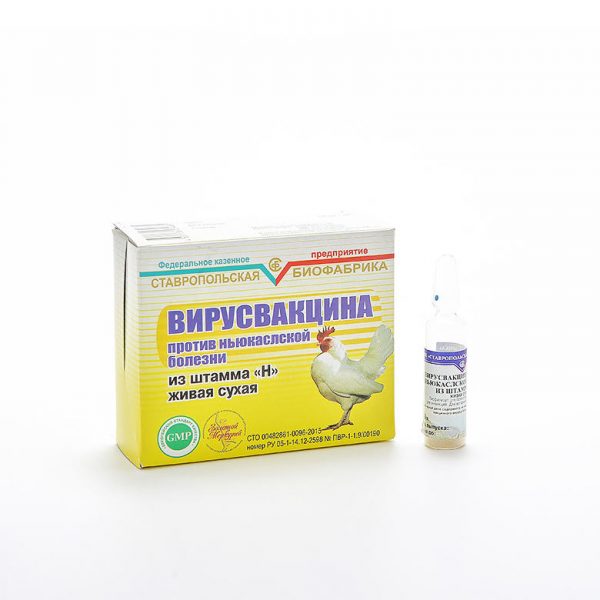 Вирусвакцина против Ньюкаслской болезни из штамма "Н" живая сухая - это лиофилизат для приготовления суспензии для инъекций, предназначенный для иммунизация взрослых кур, цесарок и индеек в неблагополучных по Ньюкаслской болезни хозяйствах. Иммунизации подлежит птица старше 60-ти суточного возраста. Вакцину применяют только внутримышечно. Разведенную вакцину вводят из расчета. Вакцину вводят в грудную мышцу или бедренную группу мышц. Вакцина расфасована в стеклянные ампулы, с содержанием в единице расфасовки по 0,1-1,0 см³ вакцинного вируса без учета наполнителя, что соответствует 100-1000 вакцинальным дозам.