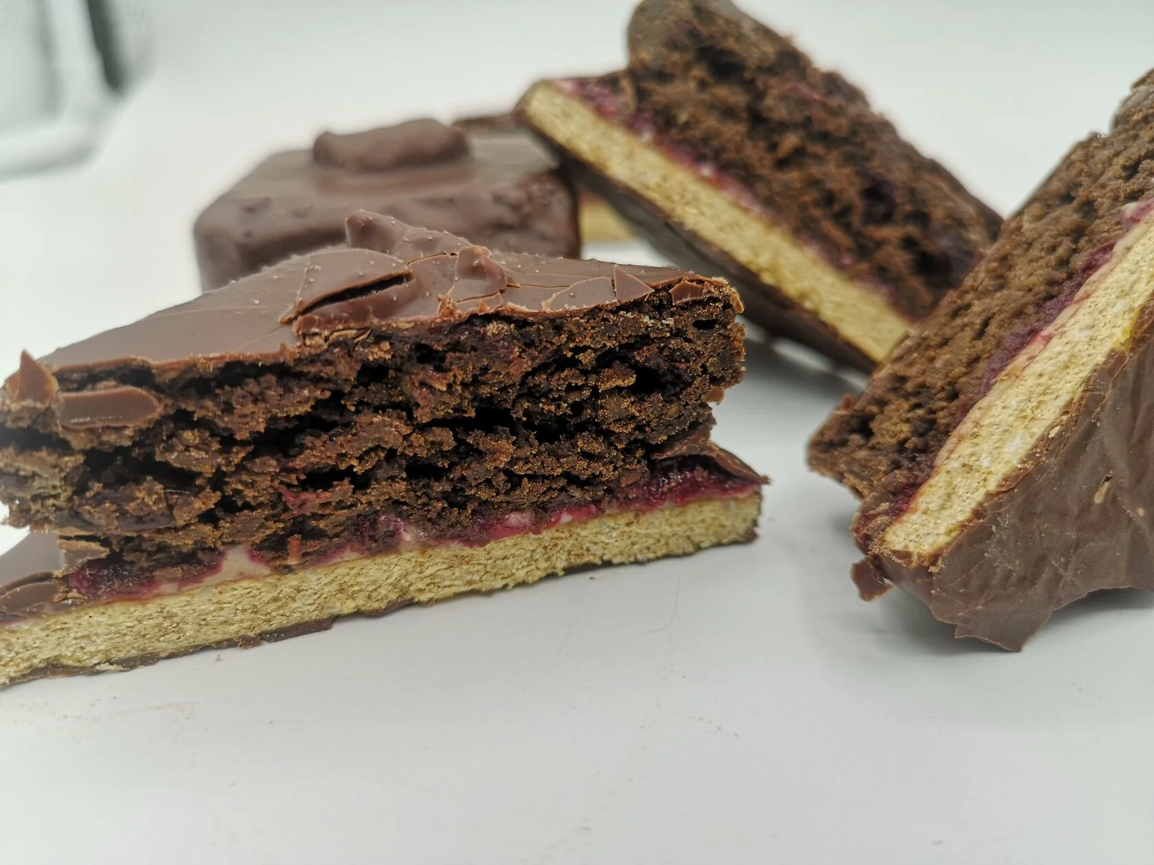 Нежный шоколадный бисквит без муки и сахара, с тонкой нотой пряностей корицы и кардамона. Прослойка вишневого джема из свежей вишни собственного приготовления без использования консервантов. джем объединен с густой карамелью из бельгийского рисового сиропа. Нижний слой - высокопротеиновый корж с протеинами из амаранта, абрикосовой косточки и желтого горошка.