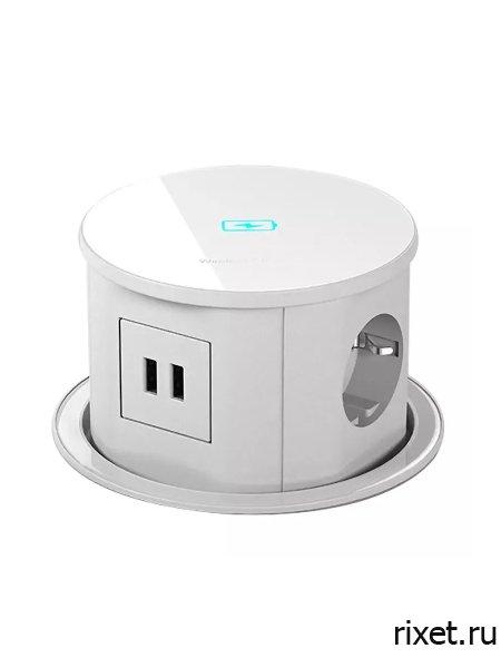 Встраиваемая выдвижная розетка в столешницу с беспроводной зарядкой, 3 EU+2 USB, белая - это удобное решение для оптимизации рабочего пространства, особенно в офисах и современных квартирах (в гостиных и кухне). Беспроводная зарядка с двумя портами USB и тремя розетками предназначена для встраивания в столы или мебель, обеспечивая удобство в повседневном использовании. Она заряжает устройства (смартфон, наушники, часы и т.п.), поддерживающие беспроводную связь (требуется ресивер QI). Вход - AC 100-250V 0.5A max. Выход беспроводной зарядки - 15W max. USB порт - 5V-3,1A. Номинальное напряжение - 250В. Расстояние беспроводной зарядки - менее 9 мм. Эффективность беспроводной передачи - ≥73%. Количество розеток - 3. Количество портов USB - 2. Длина кабеля -1,80 м. Размер - диаметр 134мм, высота 80 мм от поверхности. Установочный диаметр - 120 мм.