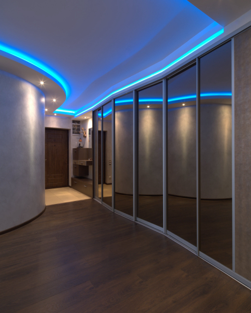 Встроенный зеркальный шестистворчатый шкаф-купе в прихожую.Геометрия шкафа-купе симметрична линии потолка прихожей. Зеркальная поверхность визуально увеличивает пространство, расширяя границы узкого коридора. Серебристые двери-купе изготовлены из профиля «Раумплюс» производства Германии. Боковые створки содержат декоративные вставки, выполненные из искусственной кожи цвета «игуана-silver». Дизайн шкафа дополняет светодиодная подсветка, которая позволяет выбирать цветовой режим по желанию хозяина