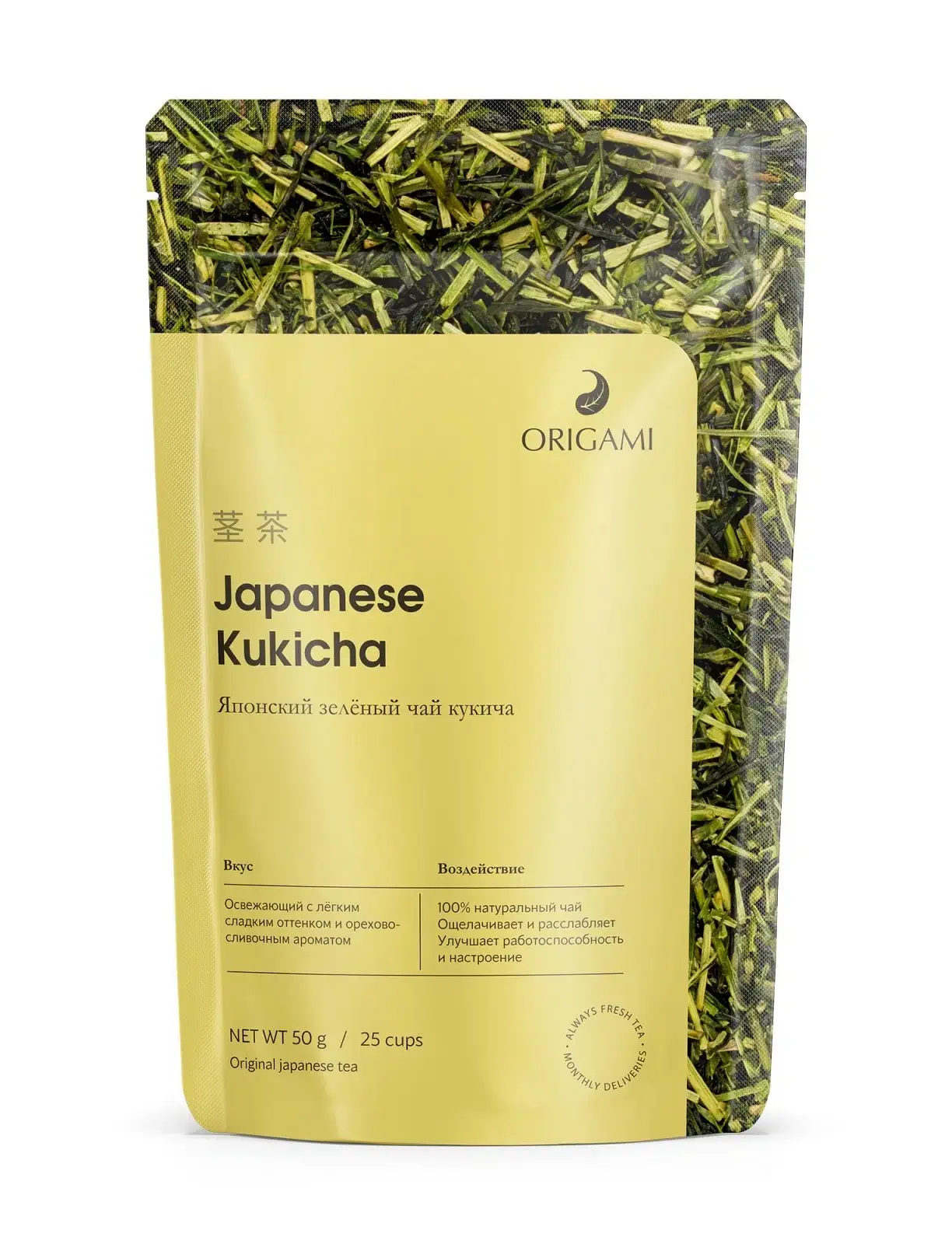 Японский чай кукича производят из чайного листа с добавлением мелких стебельков и веточек. Вкус освежающий с легким сладким оттенком и приятным орехово-сливочным ароматом.