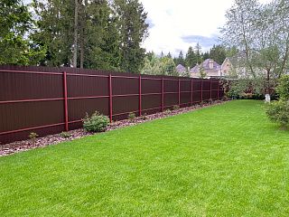 Заборы из двухстороннего профнастила по праву считаются ограждениями Премиум-класса и пользуются заслуженным спросом среди владельцев частных жилых домов, загородных коттеджей и участков в дачных посёлках. Толщина металла 0,5 мм, нанесение цветного полимерного покрытия на обе стороны оцинкованного профилированного листа обеспечивают высокую стойкостью к УФ-излучению и отличную защиту от коррозии. Надёжная защита полотна в сочетании с максимальной толщиной листа и оптимальной формой профиля выгодно отличают этот вариант от конкурентных предложений.