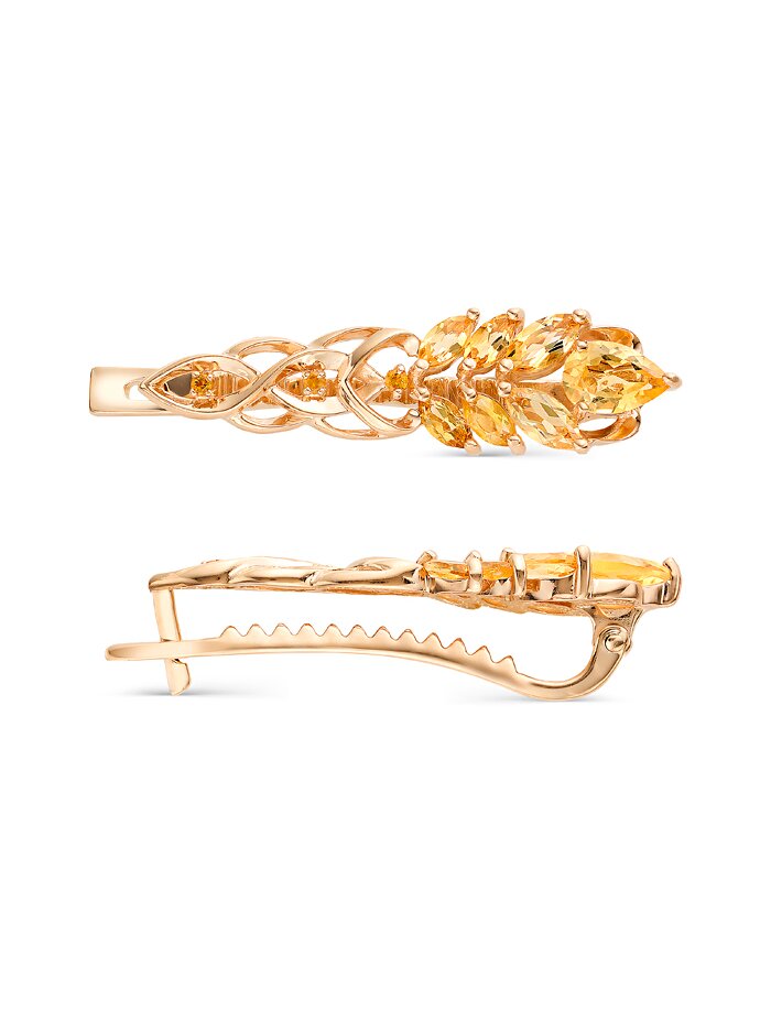 Заколка из красного золота с цитринами - это изысканный ювелирный аксессуар, сочетающий прочность золотого сплава 585 пробы (с медью) и теплый, солнечный блеск желто-оранжевого кварца. Это украшение предназначено для надежной фиксации прически, добавления акцента в образ, а также считается талисманом, притягивающим тепло, богатство и удачу. Подходит для создания классического, вечернего или романтического стиля, придавая прическе роскошный блеск. Цитрин считается камнем, приносящим удачу, энергию, успех в финансовых делах, а также способствующим улучшению настроения, подобно маленькому солнцу. Длина - 30 см. Ширина - 8 см.