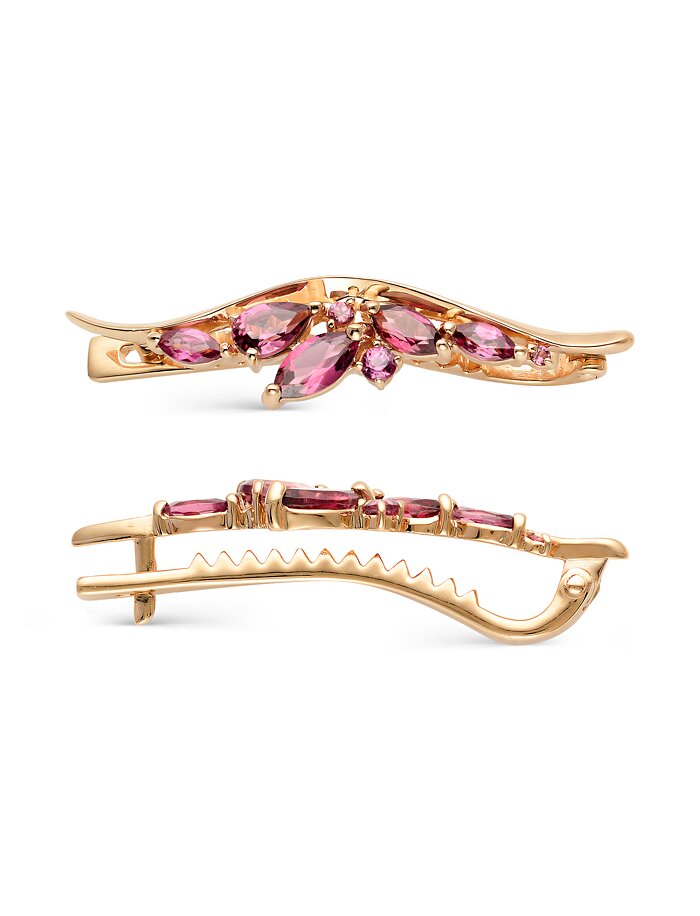 Заколка из красного золота с родолитами - это изысканный ювелирный аксессуар, сочетающий прочный сплав меди и золота (585 пробы) с драгоценным камнем из семейства гранатов розово-малинового оттенка. Она служит для украшения прически, придания образу элегантности и романтичности, а также считается оберегом, приносящим удачу, страсть и энергию. Придает образу роскошь, женственность и утонченность, идеально сочетаясь с вечерними или деловыми нарядами. Родолит, по поверьям, помогает в любовных делах, привлекает удачу, стимулирует творчество и помогает бороться со стрессом. Металл - красное золото 585 пробы. Длина - 33.45 см. Ширина - 7.75 см.