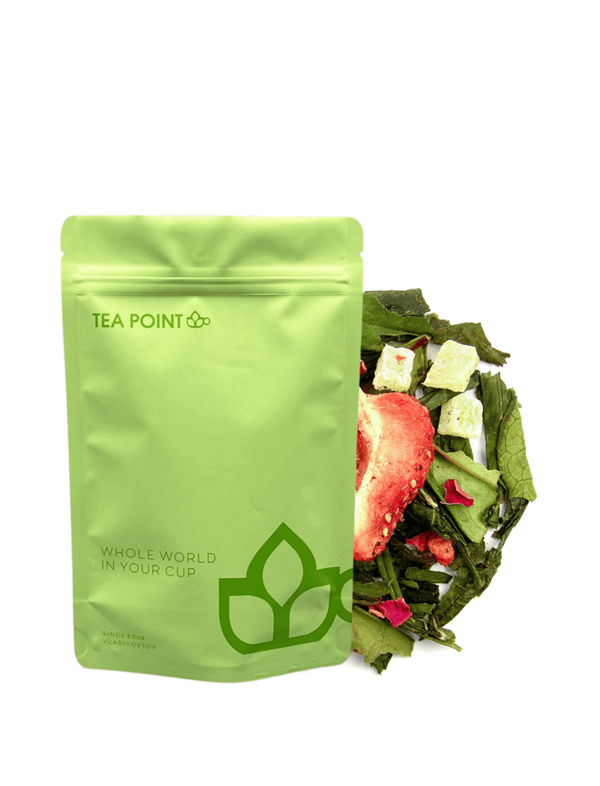 Состав: зеленый чай (71%) Сенча, Лун Цзин, белый чай (10%) Пай Му Тан, кубики папайи (папайя, сахар), кубики ананаса (ананас, сахар), ароматизатор, сублимированные кусочки и слайсы клубники, лепестки розы.