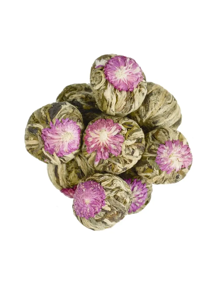 Зеленый чай, связанный вручную. При его изготовлении горсть высушенных листочков чая оборачивают вокруг одного или нескольких сухих цветков и формирут форму шара. При заваривании такой шарик очень красиво раскрывается в эффектную композицию.