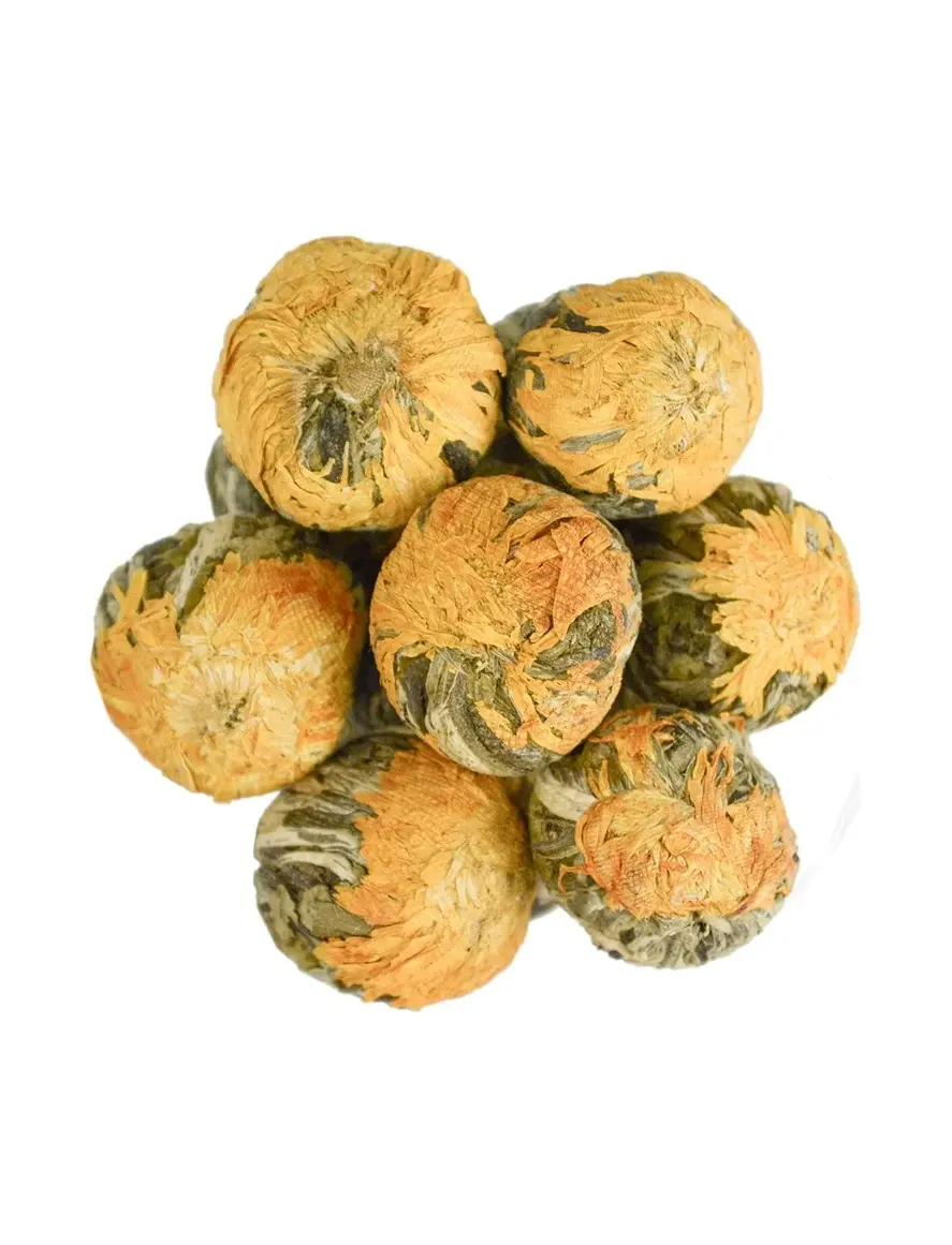 Зеленый чай, связанный вручную. При его изготовлении горсть высушенных листочков чая оборачивают вокруг одного или нескольких сухих цветков и формирут форму шара. При заваривании такой шарик очень красиво раскрывается в эффектную композицию.