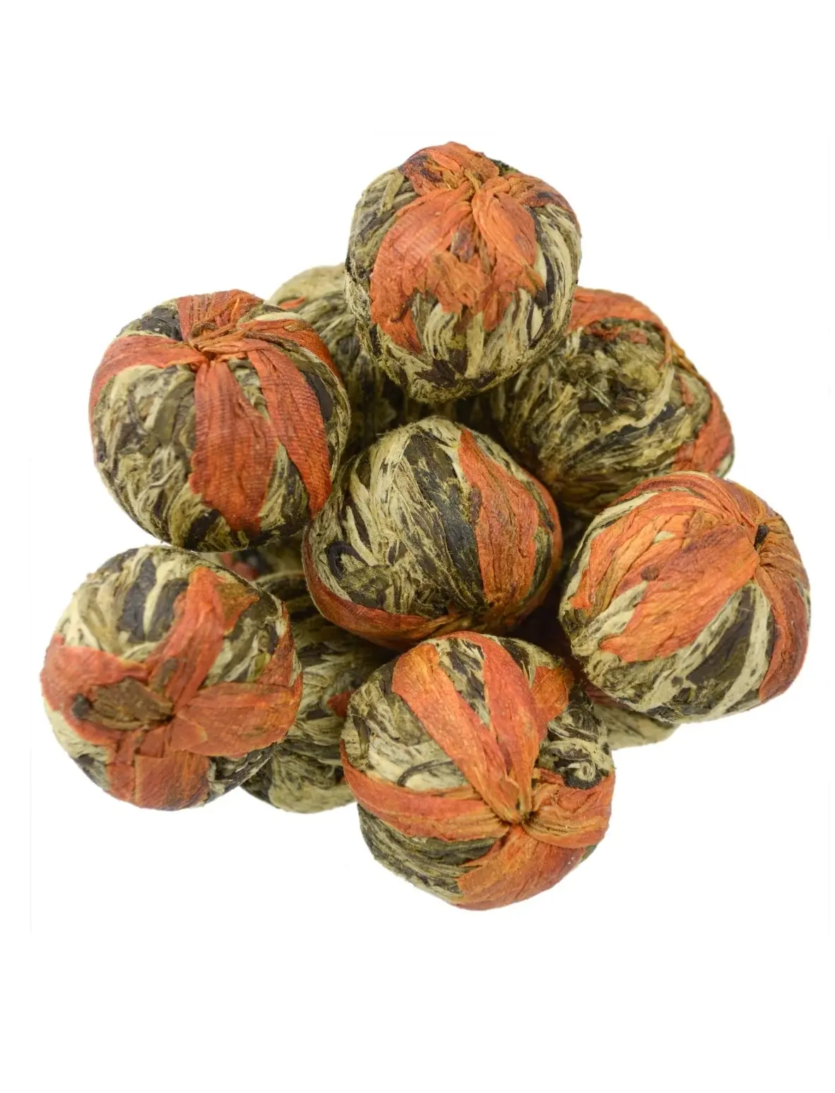 Зеленый чай, связанный вручную. При его изготовлении горсть высушенных листочков чая оборачивают вокруг одного или нескольких сухих цветков и формирут форму шара. При заваривании такой шарик очень красиво раскрывается в эффектную композицию.