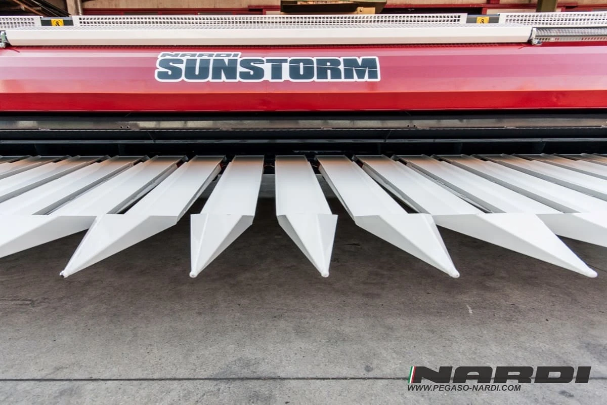 Жатка для уборки подсолнечника NARDI PEGASO SUNSTORM PANS SFH740 производится в Италии и относится к специализированному оборудованию. Машина предназначена для быстрой уборки подсолнечника. Важная особенность агрегата – безрядковая конструкция со сплошным срезом, которая увеличивает скорость работы. Технология позволяет агрегату двигаться по участку в любом направлении, не прерывая поступление продукта. Вести уборку культуры можно на полях с шириной междурядья 450-700 мм.