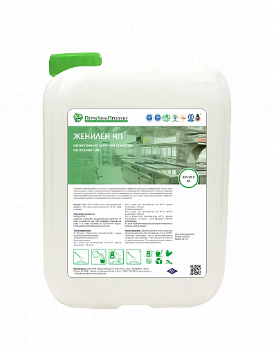 Женилен НП - это низкопенное моющее средство на основе ЧАС, предназначенное для мытья с дезинфицирующим эффектом различных поверхностей (в том числе алюминиевых), тары и технологического оборудования на предприятиях общественного питания, пищевой, молочной, кондитерской, хлебобулочной, мясной, пивоваренной, винодельческой), мясоперерабатывающей, рыбоперерабатывающей промышленностей, на птицефабриках; для мытья с дезинфицирующим эффектом транспортных средств, производственных и бытовых помещений. Состав: НПАВ <5,0%, КПАВ <6,0%, функциональные добавки <5%, щелочные компоненты <3,0%, вода питьевая. Средство хранят в плотно закрытой таре в темном месте при температуре от 0 до +25°C. Средство замерзает, после размораживания сохраняет свои свойства. Поставляемые обьемы - 5л.,10л., 30л.,200л.