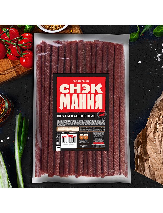 Сырокопченые колбаски, приготовленные из нежного мяса цыплят-бройлеров первого сорта. Имеют чуть грубоватую текстуру, а на срезе вкраплениями свиного шпика. Жгуты обладают ярким копченым вкусом и пряным ароматом.