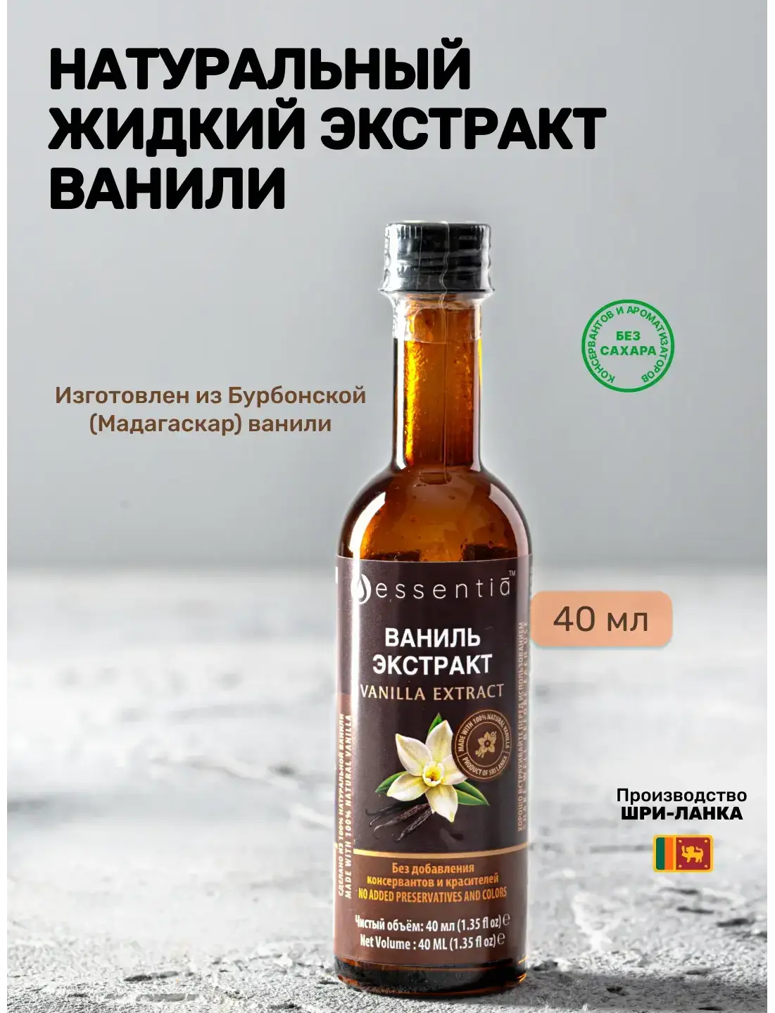Мы продаём настоящую натуральную Цейлонскую Ваниль, произведённую и разлитую в стеклянные бутылки с дозатором на фабрике в Шри-Ланке, с соблюдением самых высоких стандартов качества.