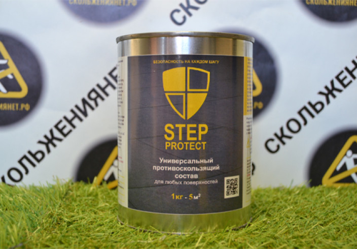 Жидкое противоскользящее покрытие Step protect на акриловой основе 1кг предназначенное для обработки напольных поверхностей с целью предотвращения скольжения. Оно подходит как для внутренних, так и для наружных работ.Состав проникает в структуру материала благодаря его пористости и закрепляется в нём. При обработке поверхности происходит процесс нанокристаллизации: состав перераспределяет мельчайшие частицы верхнего слоя напольного покрытия, создавая микронеровности — полости и выпуклости, незаметные без микроскопа. Это увеличивает коэффициент трения и обеспечивает противоскользящий эффект.