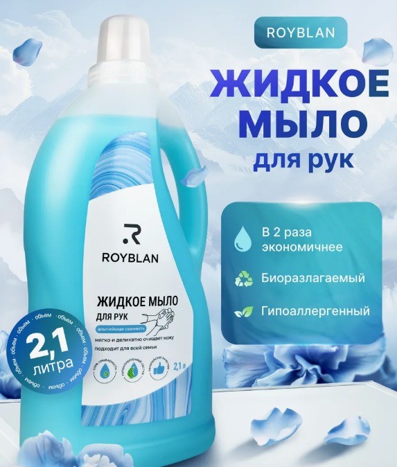 Представляем вам премиальное жидкое мыло для рук от отечественного производителя ROYBLAN. Это универсальное средство подходит для всей семьи, обеспечивая эффективную и бережную очистку кожи ваших рук. Объем 2.1 литра делает продукт экономичным и удобным в использовании, идеально подходящим для длительного применения. Наше жидкое мыло сертифицировано и прошло все необходимые испытания, что гарантирует его безопасность для здоровья. Мы понимаем, насколько важно заботиться о близких, поэтому разработали формулу, которая не только очищает, но и увлажняет кожу, предотвращая её пересушивание. Мыло имеет биоразлагаемый состав, что делает его экологически безопасным выбором для вашего дома. Аромат альпийской свежести наполняет пространство легким и приятным запахом, создавая атмосферу чистоты и комфорта. Каждый раз, используя это мыло, вы погружаетесь в мир свежести, который дарит ощущение чистоты и уюта. Жидкое мыло ROYBLAN – это не просто средство для мытья рук, это забота о здоровье и экологии. Мы уверены в высоком качестве нашего продукта и его способности удовлетворить потребности даже самых требовательных пользователей. Выбирая наше мыло, вы выбираете надежность и безопасность для себя и своей семьи. Пусть каждый момент, проведенный за уходом за руками, станет приятным и полезным. Жидкое мыло ROYBLAN – ваш надежный помощник в поддержании гигиеничности и свежести в доме. Откройте для себя новый уровень ухода за кожей рук с натуральным составом и изысканным ароматом, который подарит вам радость и комфорт в каждом дне.