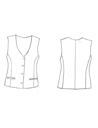 Жилет "Классик" на подкладке для девочек старшей школьной и подростковой возрастной группы. Изделие полуприлегающего силуэта со средним швом на спинке, боковые линии изогнуты, имеют облегание по лини груди и талии. Горловина расширена и углублена по полочке до уровня груди, горловина спинки естественной формы. Линия плеч естественная по высоте и форме, длина укорочена. Линия груди естественная по форме. Линия проймы на естественном уровне, овальной конфигурации. Линия талии на естественном уровне. Линия низа прямая ровная, расположена на 9см ниже линии талии. Застежка однобортная на 4 ряда пуговиц.Формообразование обеспечивается за счет изогнутых боковых линий и рельефов по полочке, исходящих от проймы через центр грудных желез к талии, и спинке, исходящих от проймы через выступающие точки лопаток к талии.В рельефах спинки расположены хлястики на 2 пуговицах для регулировки прилегания по линии талии. На полочке параллельно линии низа расположены прорезные карманы в рамку.