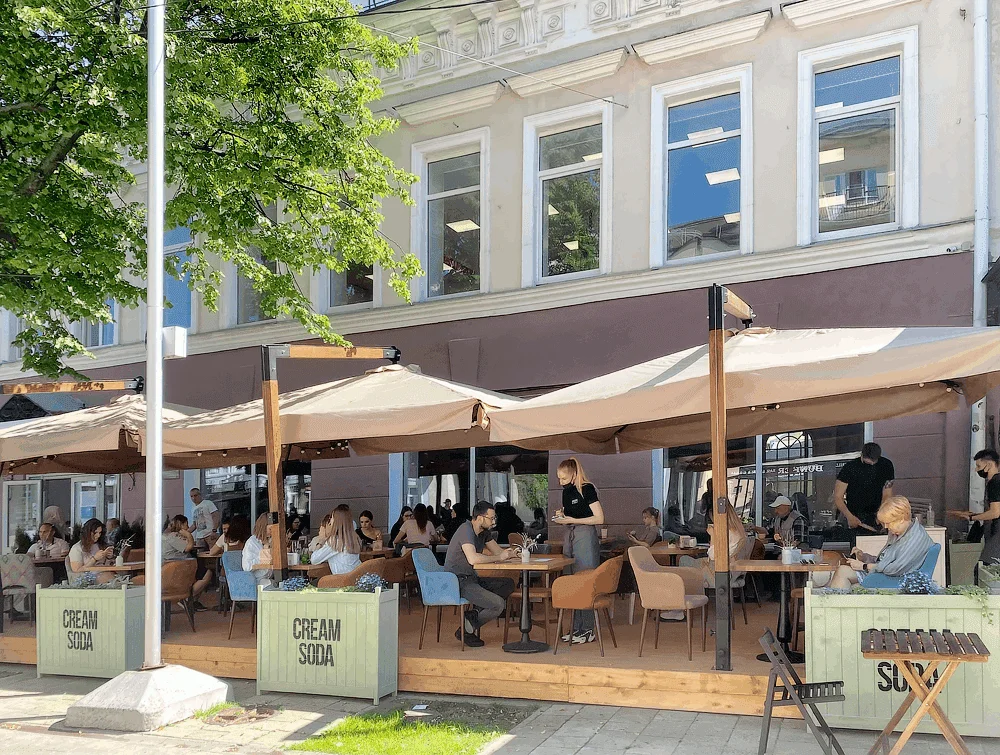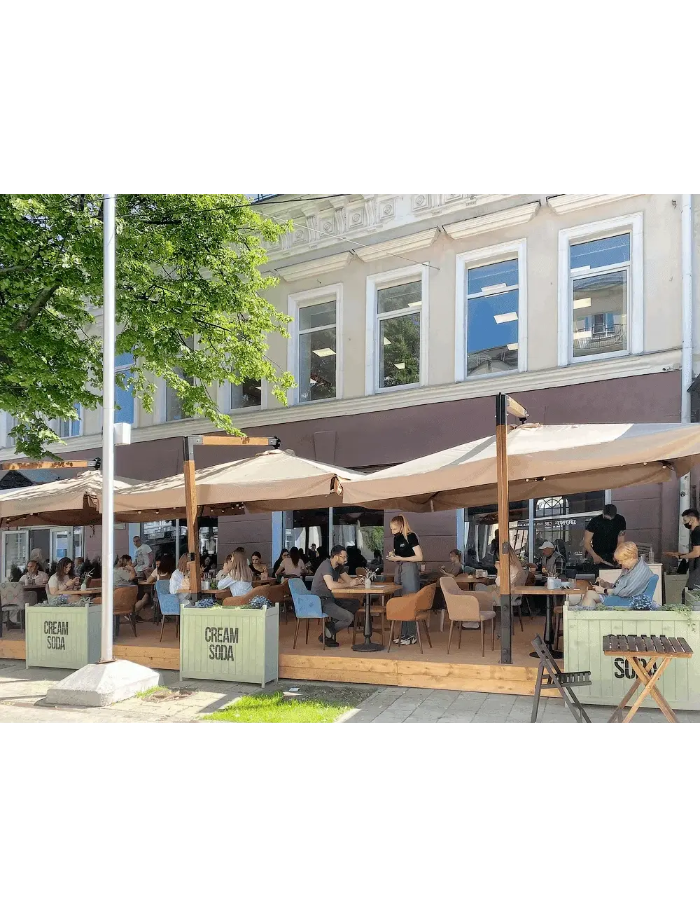Тип:зонт с боковой опорой на деревянной стойке Размеры типовые: 2.5 х2.5 м, 3х3 м, 3.5х3.5 м, 3х4 м, 4х4 м. Размеры не типовые ( изг. на заказ) 2х2 м, 2х2.5м, 3х2, 3х2.5м, 4х3.5м. Высота до купола: 2-2.2 м при объединении в группы высота может быть увеличена Применение: летнее кафе, терраса, веранда, дача, ресторан, загородный дом, фестивали, выставки. Опора: Сталь с полимерным покрытием. Размеры основания (зонты до 2х2, 2.5х2.5, 3х3 м- 1200х780 мм) на 2 ячейки. У зонтов 3х4, 3.5х3.5м, 3х4 м, 4х4 м- 1200х1400 мм. ( на 4 ячейки). Стойка: Лиственница ЛВЛ брус 75х75 или 100х100 мм с защитной пропиткой. Высокая прочность на изгиб, кручение Спицы: Стальные или алюминиевые ( выбор), профильная труба с порошковым напылением или алюминиевые спицы с ребрами жесткости. Угловые стыковочные углы: Сталь с полимерным покрытием. Комплектующие: Россия, Италия Ткань: 100 % ПЭ Оxford 600 DEN , с водоотталкивающей полиуретановой пропиткой. Плотность ткани 230 г./м.кв. Проклейка швов купола для 100% защиты от дождя на швах ( доп. опция по желанию). Угол наклона (количество положений): Наклон купола в продольной плоскости и фиксация в любом из 6 положений. Монтаж: Напольный. Под подиум, под бетонное основание ( пр-во на заказ). Класс ветростойкости: 2-3 ( до 8-14 м/с) в зависимости от размера купола. Поворотный механизм: На 360 гр. вокруг своей оси и фиксация в любом положении. Входит в комплект. Срок службы зонта: 10 лет Срок службы ткани: 3 года Форма зонта: Прямоугольная. Круглая. Квадратная. Управление: ручное -лебедка Пригруз: Плиты из гранитной крошки размером 500х500 мм. Вес 75 кг. Масса груза на зонт размером 3х3м- 150 кг. 4х4 м- 300 кг. В стоимость зонта не входят ( продаются отдельно) Гарантия: полгода